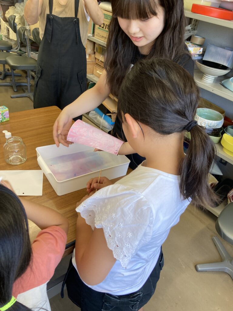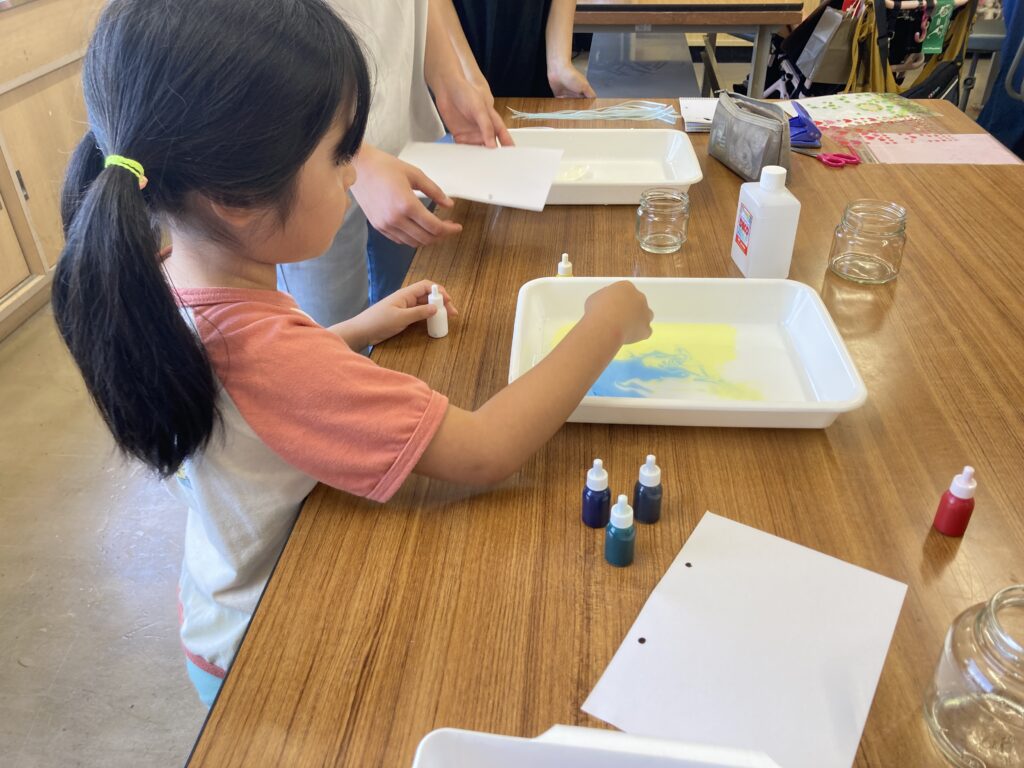 子どもたちは、6色あるインクの中から3色選び、水面でインクが広がったり混ざりあったりする様子を楽しんでいました。インクの垂らし方や串での混ぜ方によって全く違う作品に仕上がり、面白かったです。
