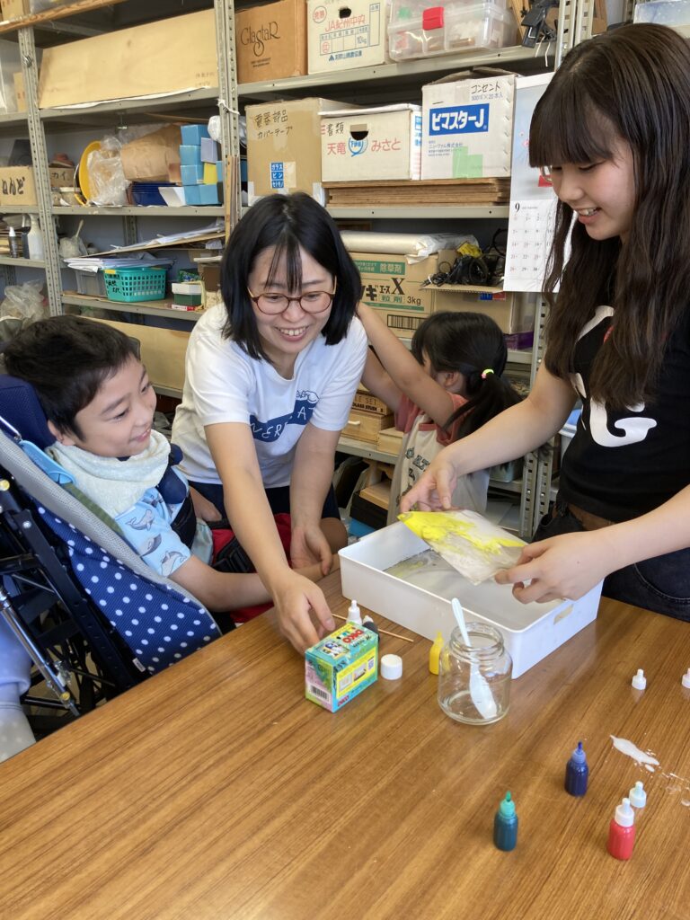 高校生のMさんが、まめまめの会の子どもたちのためにアートイベントを開催してくれ、8家族が参加しました。