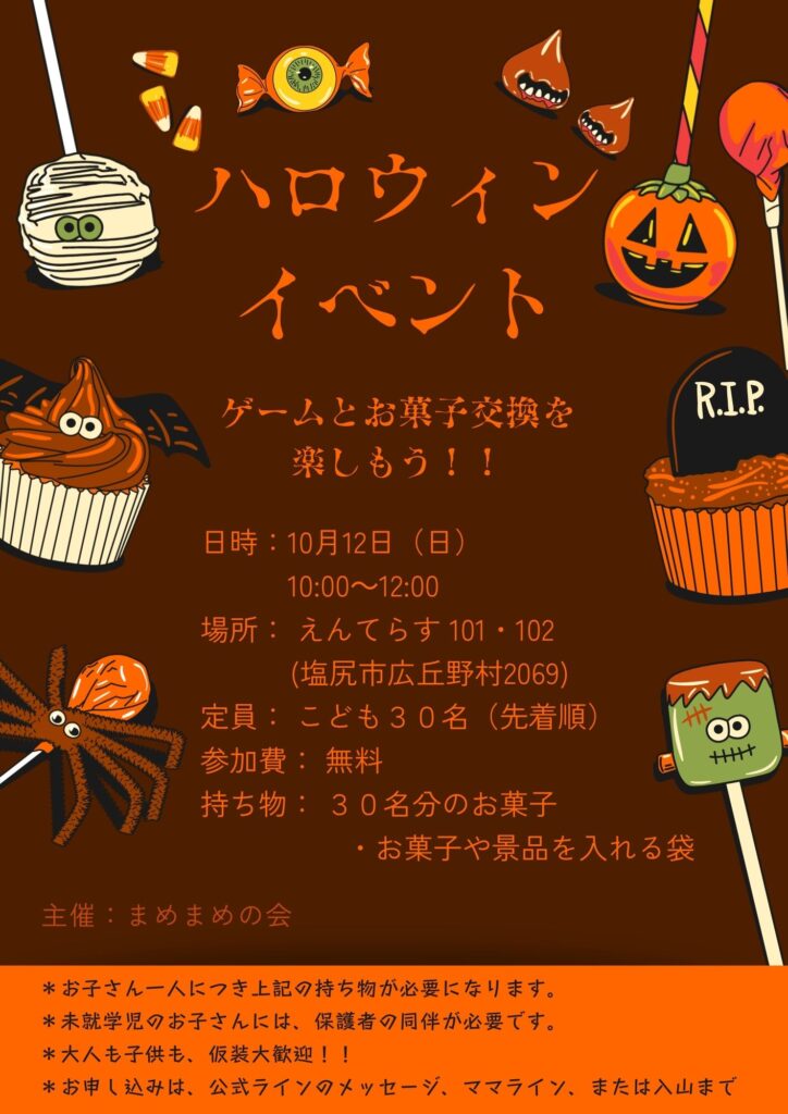10月12日(土)、塩尻市のえんてらすで「ハロウィンイベント」を行いました。総勢35名の子どもたちが参加してくれて、会場は大賑わいでした。